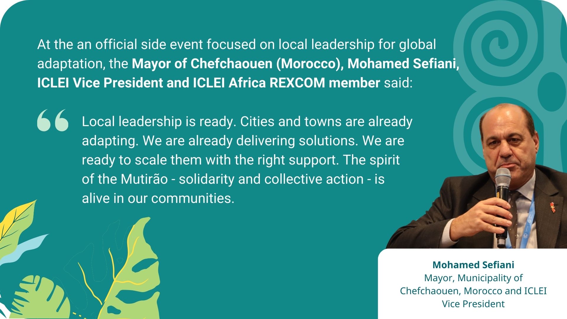 In a session organised by GlobalABC, ICLEI Vice President and ICLEI Africa REXCOM member, Mayor of Chefchaouen (Morocco), Mohamed Sefiani, emphasised that cities are ready to deliver and now need a financial system ready to finance locally-led action.
