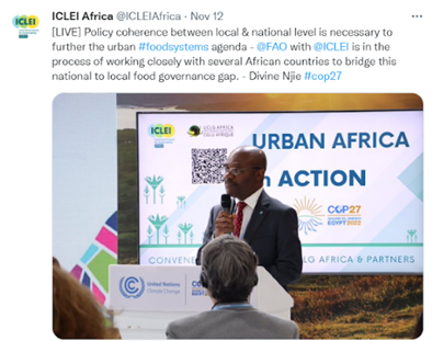 Policy coherence between local & national level is necessary to further the urban food systems agenda – FAO with ICLEI is in the process of working closely with several African countries to bridge this national to local food governance gap.