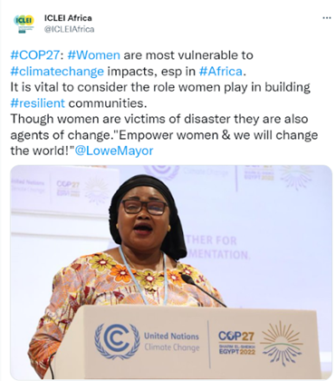Women are the most vulnerable to climate change impacts, especially in Africa. It is vital to consider the role women play in building resilient communities. Though women are victims of disaster they are also agents of change.Empower women & we will change the world!” – Ms Rohey Malick Lowe, Lord Mayor of Banjul City Council, the Gambia, and President of the Network of Local Women Elected in Africa (REFELA)
