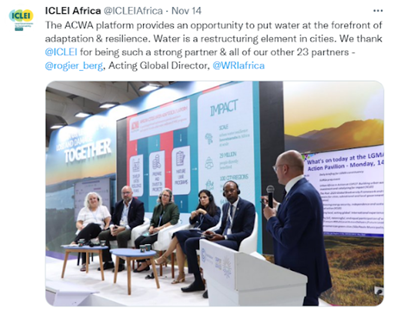 - 14 Nov – Building Urban Water Resilience in Africa: Accelerating investment and catalysing action (ACWA Platform launch – ICLEI, WRI, UN Climate Champions)