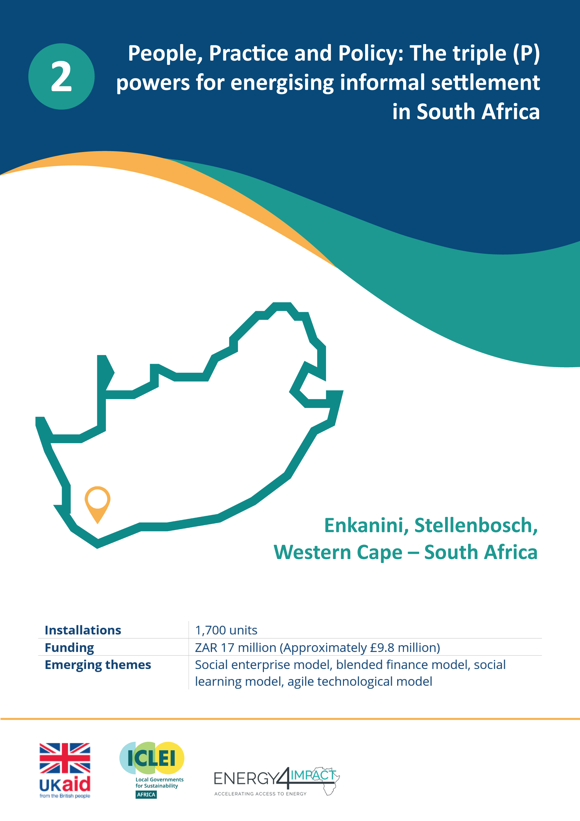 Through a Public-Private Partnership (PPP), the iShack project unlocked government electricity subsidies – known as Free Basic Electricity (FBE) – to support the adoption of Solar Home Systems (SHSs) in Enkanini. The iShack case is an example of a government partnership with the private sector to unlock the full potential of renewable energy services for an informal community in the Stellenbosch Municipality.