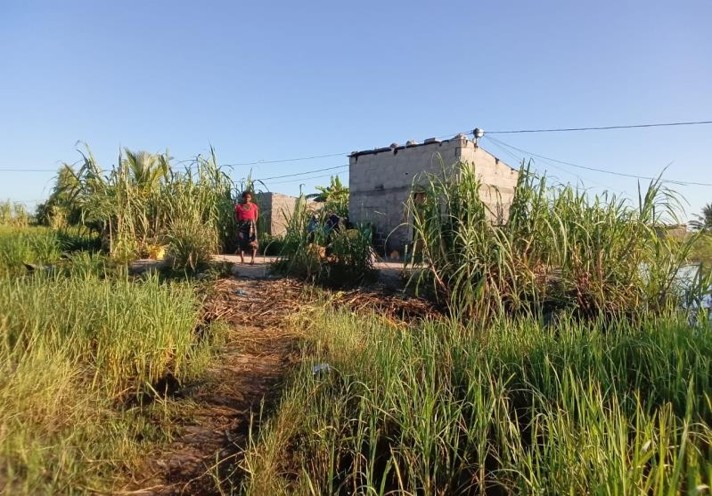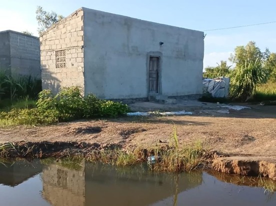 “The house is built with cement blocks and has a sheet metal roof. It is difficult to access, as it sits in a low-lying area with narrow paths and open drainage ditches. After it rains, water often remains stagnant around the house for up to a week.”