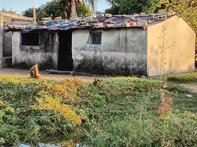 “This house is located in a low-lying area that receives all the runoff water from upstream. The roof is made of damaged metal sheets, and plastic was added as a temporary solution due to the lack of better materials.”