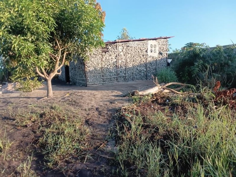 “This house is made of pieces of zinc sheets without good security on the roof, reinforced with stones to prevent it from flying away, as it previously fell in a Cyclone.”