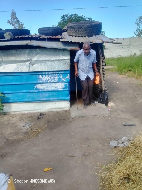 “This small house, made of sheet metal with tires placed on the roof to hold it down, is home to an elderly man. He was assisted by neighbours in building the house, which is located in a high-risk area.”