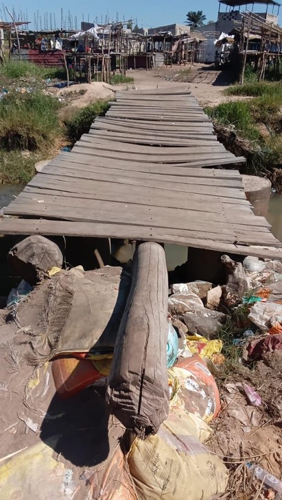 “This is the footbridge that the community uses for crossing. It was built by local residents, but it still poses a danger to children going to school or the market.”