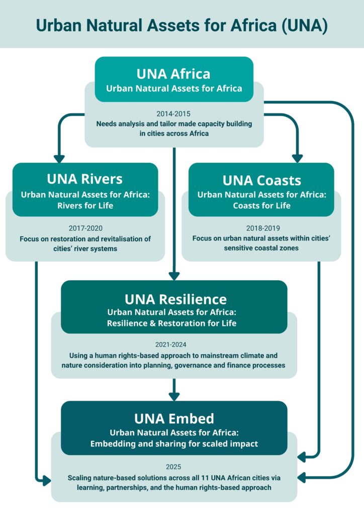 Since 2014, the UNA project – funded by SwedBio through the Swedish International Development Cooperation Agency (Sida) – has supported cities and helped shift development narratives by positioning nature as an essential asset and part of urban infrastructure. Over the years, the UNA project supported 11 cities across nine countries in their transition towards a more sustainable development trajectory. Through the UNA project’s five flagship projects – Urban Natural Assets for Africa (UNA Africa: 2014-2015), Urban Natural Assets: Rivers for Life (UNA Rivers: 2017-2020), Urban Natural Assets: Coasts for Life (UNA Coasts: 2018-2019), Urban Natural Assets: Resilience and Restoration for Life (UNA Resilience: 2021-2024) and Urban Natural Assets: Embedding and Sharing for scaled Impact (UNA Embed: 2025) – the project facilitated the integration of NbS into governance, planning and later finance. In doing so, it built urban resilience and generated sufficient agency and momentum to support an ongoing process of transformative change.