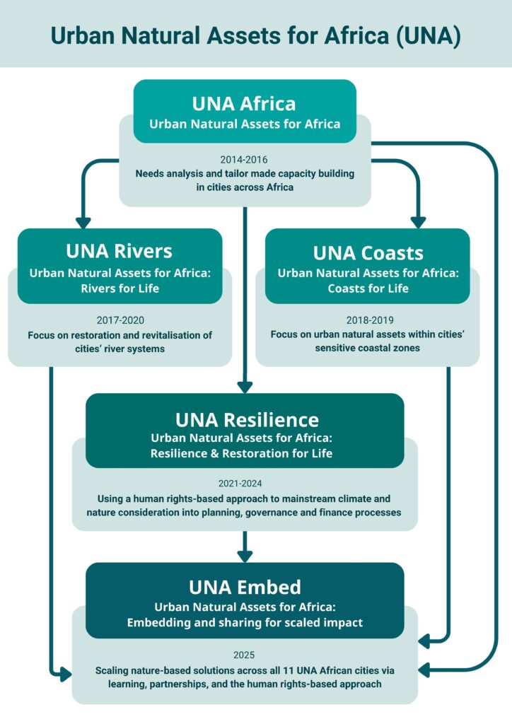 Since 2014, the UNA – funded by the Swedish International Development Cooperation Agency (Sida) through SwedBio at Stockholm Resilience Centre – has supported cities and helped shift development narratives by positioning nature as an essential asset and part of urban infrastructure. Over the years, the UNA project supported 11 cities across nine countries in their transition towards a more sustainable development trajectory. Through the UNA project’s five flagship projects – Urban Natural Assets for Africa (UNA Africa: 2014-2016), Urban Natural Assets: Rivers for Life (UNA Rivers: 2017-2020), Urban Natural Assets: Coasts for Life (UNA Coasts: 2018-2019), Urban Natural Assets: Resilience and Restoration for Life (UNA Resilience: 2021-2024) and Urban Natural Assets: Embedding and Sharing for scaled Impact (UNA Embed: 2025) – the project facilitated the integration of NbS into governance, planning and later finance. In doing so, it built urban resilience and generated sufficient agency and momentum to support an ongoing process of transformative change.