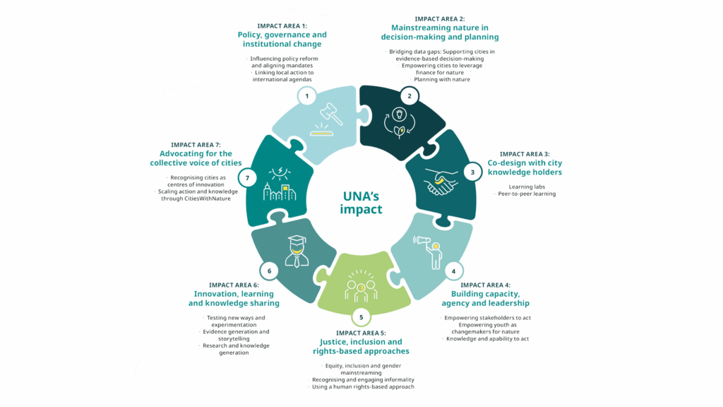 Through a deeply innovative, collaborative and HRBA, the UNA project supported cities across seven interconnected impact areas. The seven impact areas have been the basis for sustainable, resilient urban development that considers the complexity of urban systems. The impact areas encourage holistic and adaptive thinking to help the UNA project achieve its goals. This approach enables cities to progressively address the realities of rapid urbanisation, climate risk and biodiversity loss. It transforms urban development trajectories and strengthens cities’ interconnectedness with their natural systems