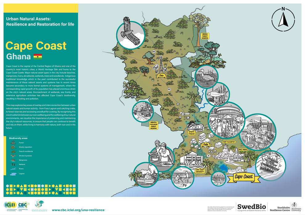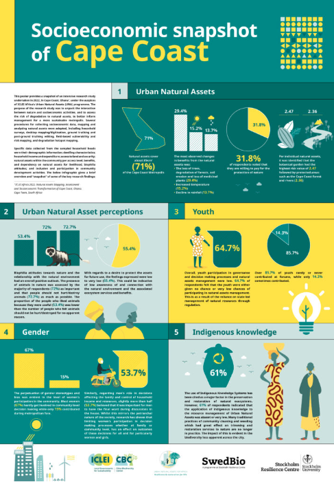 Between 2022 and 2023, the UNA project invested in city-wide natural asset mapping in Bo City, Sierra Leone and Cape Coast, Ghana. This process enabled cities to answer four key questions: (i) Which natural assets exist? (ii) Where are they located? (iii) What condition are they in? and (iv) What threats are they facing? This information helped facilitate informed planning, decision-making and financing. To give cities a more holistic picture of the socio-economic dynamics and their implications on livelihoods and natural assets, mapping and data collection was extended to the socio-economic landscape. The socio-economic survey undertaken in both project cities focused on understanding the socio-economic landscape and assessing the interlinkages between people’s day-to-day activities, the economy and the environment. The survey focused on several different thematic areas, including household characteristics, economic profiles, gender dynamics, attitudes toward nature and people’s relationship with nature. This deeper understanding helped shape contextually relevant strategies and actions in both cities.